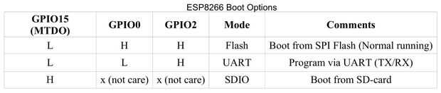 Para la ejecución normal del programa GPIO0 y GPIO2 deben sacarse a Vcc (3.3V) y GPIO15 las necesidades de ser tirado a la tierra, cada uno con una resistencia en la resistencia de rango 2 K a 10 K. Una resistencia de 2K da mejor inmunidad de ruido. OLIMEX utiliza resistencias de 2K SparkFun utiliza resistencias de 10K. Utilizo 3K 3 resistencias.