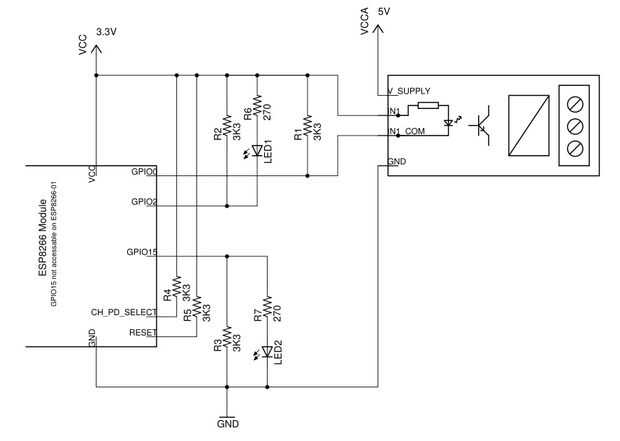 El esquema de arriba muestra cómo utilizar GPIO0 y GPIO2 y GPIO15 como salidas. Este circuito incluye las necesarias resistencias de pullup/desplegable así. Nota el módulo de relé de 5V por GPIO0 es opto-aislado y tiene una conexión común independiente de la entrada. Es importante que el voltaje de 5V VCCA no se aplica al pin ESP8266.