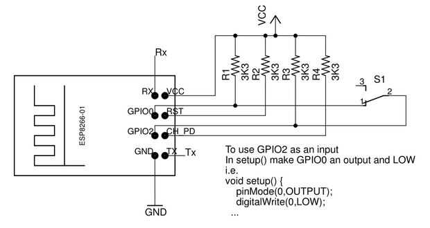 El circuito de arriba usa el módulo de ESP8266-01 como ejemplo. Sin utilizar este truco, el ESP8266-01 no tiene las patas gratis para usar como una entrada si ya están utilizando pernos de RX/TX para la conexión UART.