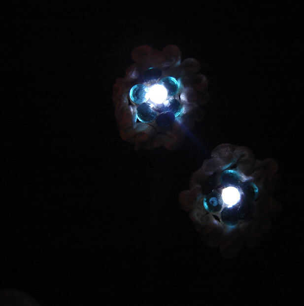 me ha intrigado con la idea de la incorporación de LEDs en la joyería y ha visto a varios grandes ejemplos de esto en instructables. Pedí algunas lentejuelas LED en línea que lo planeado para este fin. Sin embargo, fabricación de la joyería no es algo que tengo mucha experiencia con eso cuando subió con un diseño realmente parecía más apropiado usar como un accesorio para el pelo en su lugar. Inicialmente había planeado utilizar a éstos como broches de pelo la batería titular fue un poco demasiado abultado, así que poner alguna cinta alrededor de él y unida a las horquillas.