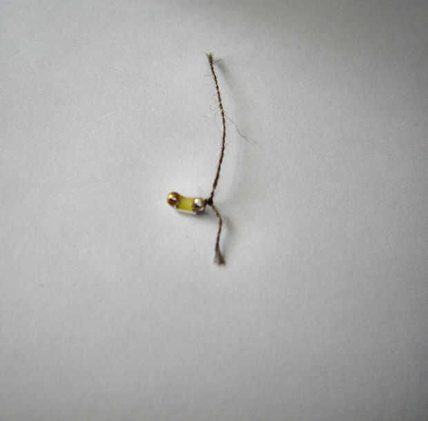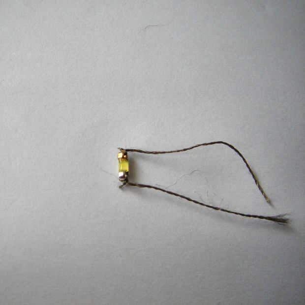 Así que tengo dos soportes de batería hechas a raíz de este instructable. Había hecho la parte superior flatter un poco para que el LED y rhinestones caben en.  Até un trozo pequeño (2-3cm) de hilo conductor para cada uno de los conductores en el LED. Entonces pegué lentejuelas LED en la parte superior del centro de soporte de la batería con el pegamento Krazy.  No intentar conseguir cualquier pegamento en el hilo ya que parece impedir la conductancia *.  Cuando el pegamento esté seco, atar los dos hilos al poste apropiado de soporte de la batería y recorte el exceso de hilo.  (Ponga las baterías en y prueba para asegurarse de que el LED se enciende para arriba antes de continuar).