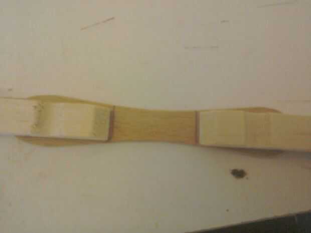 cortar el palo en este caso debido a la forma del palo esto fue decidido por el punto en que su anchura y la clavija fueron iguales. Esto me dio 2 pedazos que fueron aproximadamente de 1" 1/4 (30mm) de largo. [aquí después conocida como la mandíbula inserto (s)]