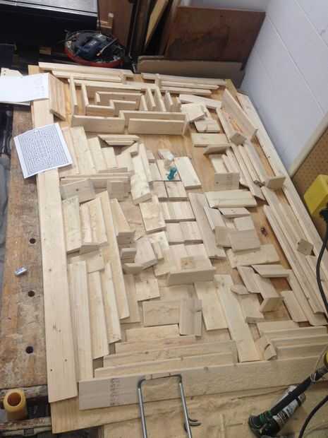 Una vez que tuve todas mis cortes hechos, puso hacia fuera en orden en la base de madera contrachapada así sabría donde todo tendría que ir más adelante.
