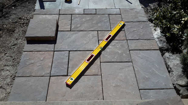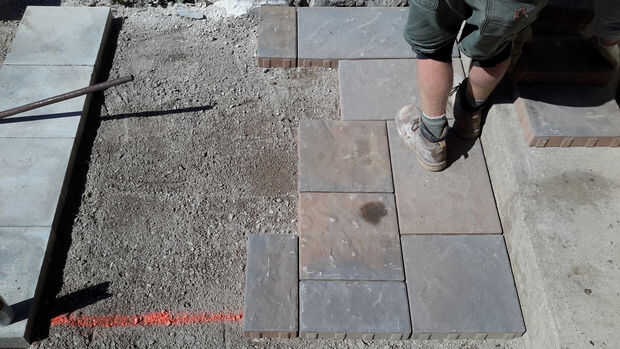 Pintar una línea guía general para la colocación y comience a colocar a sus adoquines. Asegúrese de no dar un paso en la base de la proyección que solo preparada en el último paso. Los adoquines deben colocarse uniformemente sobre el terreno y las proyecciones deben estar nivelados con una ligera pendiente de la casa.