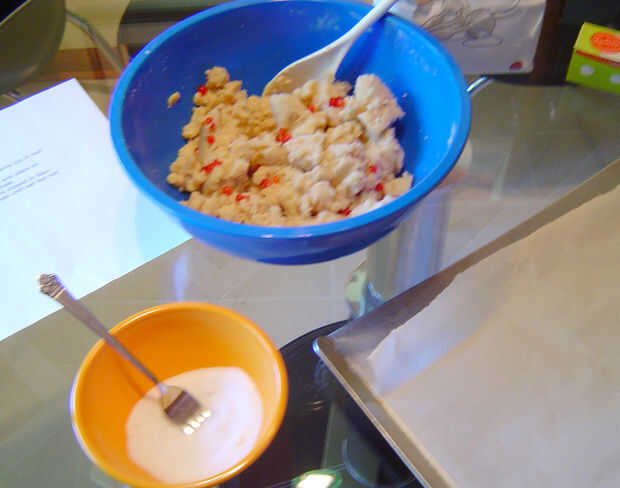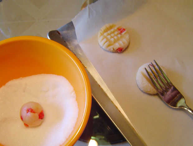 Ahora se necesita la cocción hoja forrado con papel sulfurizado un tazón de azúcar y un tenedor.  Precalentar el horno a 400 grados.   Rodillo la masa en bolas del tamaño de la nuez y en el azúcar.  Me gustan las galletas enrolladas azúcar aunque la receta original no llama para esto.  Les da un brillo crujiente, sabroso.  El papel de pergamino y entrecruzamiento con el tenedor.