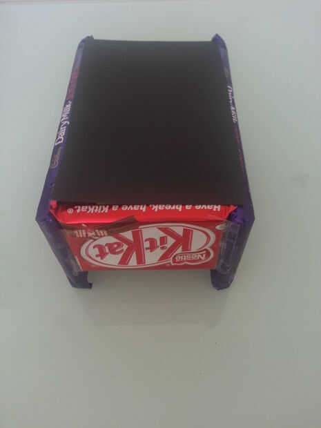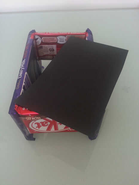 Coloque la estructura de chocolate en el pedazo de papel de la tarjeta negra y trace una línea alrededor de él. Cortar la tarjeta y colocarla en la parte inferior. Ajustar la tarjeta para caber perfectamente tuve que cortar la tarjeta un poco así que no pude verlo cuando puse el chocolate encima de la manera correcta. Asegúrelo con cinta