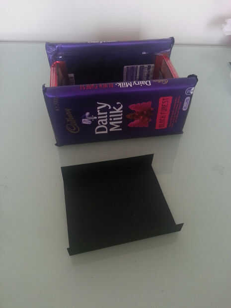 Para crear el pequeño estante interior, cortar un rectángulo y equipadas para la anchura del chocolate y asegurado con cinta. No hay ninguna forma correcta de crear la plataforma.