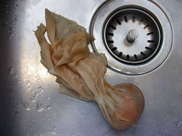 Retire las gomas con cuidado y tomar los huevos de los paños. Retire las pieles de cebolla (puede lanzar las pieles de cebolla usadas en el compost).