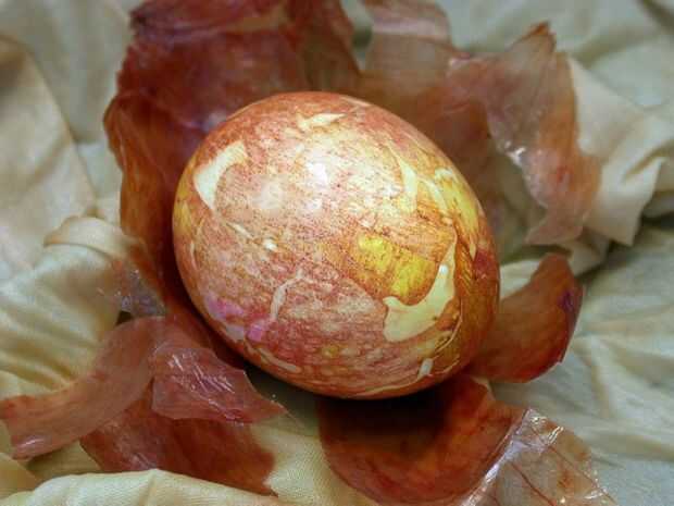 Listo Las cáscaras de los huevos ahora se cubrirá con hermosos diseños transferidos de las pieles de cebolla en tonos de marrón, amarillo y verde.