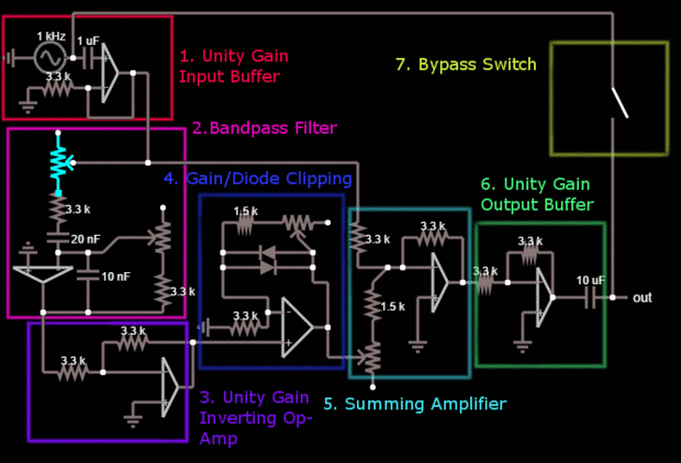 1) la primera etapa (coloreada en rojo, arriba) es el búfer de entrada de unidad típica ganancia. Contamos con nuestra señal de entrada de la guitarra que entra por un conector de audio de 1/4", imitado por nuestra fuente de voltaje de 1 kHz. Pasa a través de un condensador de 1uF a encogimiento de hombros de cualquier potencial tensión de offset de DC y luego procede a la terminal de no invertir de nuestro primer op-amp, que es, como todos nuestros amplificadores operacionales son, cableados en la retroalimentación negativa. En esta configuración particular del op-amp, el terminal inversor está conectado directamente a la salida del terminal, así que tenemos una señal de salida de ganancia unitaria. Impedancia de entrada de la alta eficacia e impedancia de un op-amp salida efectiva baja asegura que no tiene que preocuparse por problemas con el circuito de carga.