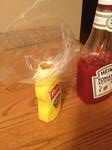 La esquina de una bolsa de sándwich del palillo abajo en el tarro de mostaza.