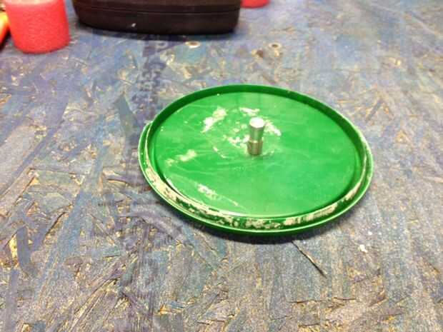 Luego perforé un agujero aunque una tapa vieja de un cubo de yeso Spackle para actuar como soporte central de la falda. para medir propuso un perno fue atornillado y el orificio central del disco. Después, planeo sujetar al disco con una pipa pequeña que me permiten tomar lecturas de presión. Algunos pueden perplejo en cuanto a para qué sirve la tapa. Esto actuará como una arandela grande sosteniendo el centro de la falda contra el disco y permitiendo que la falda llenada de aire para mantener la forma de un rosco. La falda habrá estratégicamente los agujeros en él para permitir que el aire hacia fuera para formar un cojín de aire. Por ahora estoy usando esta sucia tapa para medir la distancia del centro será colocar los separadores.