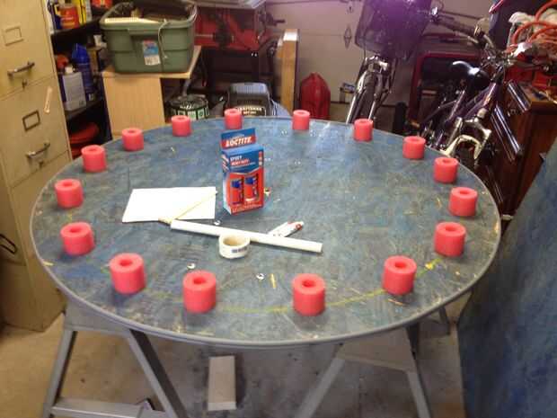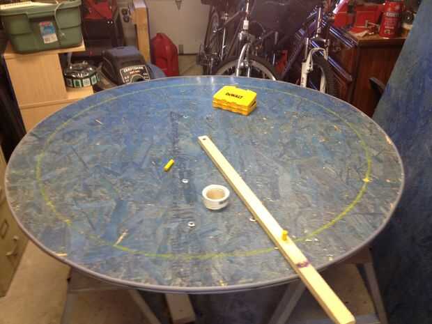 Para empezar teníamos que encontrar la colocación de los separadores que utilizará. Para lograr esto saqué mi fiel círculo del palillo a partir de la basura que había utilizado originalmente para trazar un círculo en la hoja de OSB en el inicio del proyecto. Había medido hacia fuera de un radio de 20 pulgadas y me perforó un agujero en el palo. Esta vez utilizado un crayón amarillo para seguimiento. Ooooo bonito círculo.