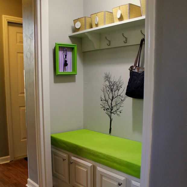 Steph necesita un lugar para guardar sus llaves, bolso, zapatos y más, así que creamos una zona de aterrizaje/aire en un armario del pasillo en su casa.