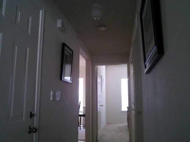 Para mi pasillo, me decidí a deshacerse de la luz de techo y el detector de humos mediante el uso de la herramienta "Pincel corrector" simple. Yo simplemente ALT-haga clic en el techo más cercano los objetos y luego a la izquierda del ratón hace clic sobre los objetos con "Reemplazar" de la barra de menú desplegable debajo de la barra de menú en la parte superior del lugar de trabajo de Photoshop. Cuando siento que he cubierto lo suficiente, cambiar la barra de menú desplegable de "Normal" y esto me permite mezclar los alrededores muy rápidamente y fácilmente.