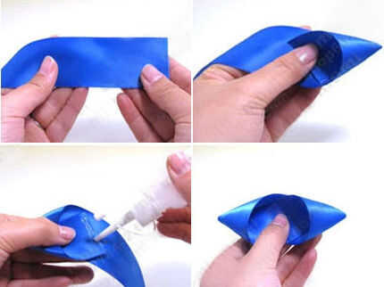 Totalmente preparar los siguientes materiales en el cuadro 1. Cortar una cinta azul de 22cm; Sujete un extremo de la cinta. Doblar un extremo de la cinta hacia adentro. Voltear el extremo doblado de la cinta y el pegamento con cola de alcohol.