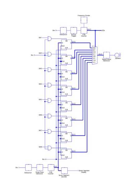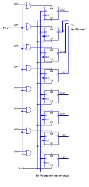 Permite comenzar con 1 botón, que aumenta la frecuencia de tono actual. Primero esta entrada tiene que pasar por un debouncer, por lo que la señal sólo se activa una vez por cada pulsación. A continuación, la señal debounced es enviada al módulo generador de pulso. Esto asegura que el tono actual se le incrementa una vez y sólo una vez con cada pulsación. La salida del generador de impulsos va al contador, que almacena y aumenta el tono actual. La salida del contador va al módulo de sseg_dec, de modo que la frecuencia actual se muestra en display de siete segmentos del Consejo Nexys2. La salida se envía también a la entrada de cada flip-flop D, listo para ser "salvo" al ritmo correspondiente.