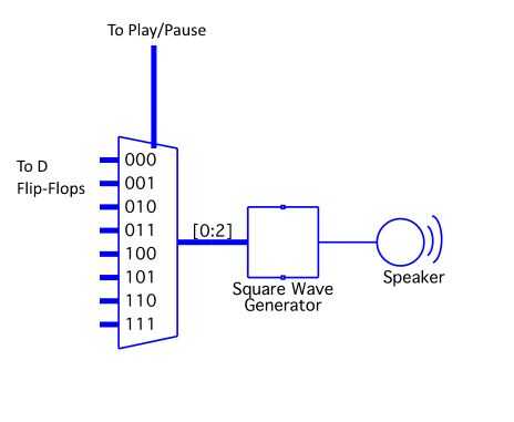 La salida del multiplexor está conectada a un generador de onda cuadrada. Basado en la entrada de 3 bits, el generador de onda cuadrada alterna su señal de salida para producir una onda cuadrada con una frecuencia determinada. Esta onda es enviada a los altavoces, que jugarán el tono correcto.
