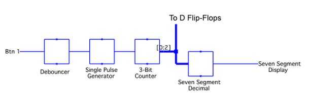 El flip-flop tienen otra entrada, que es el clear o reset. Esta entrada está conectada al botón 4, por lo que cada vez se presiona el flip-flop volverá a una salida de 000(binary). Tenga en cuenta que este botón también no requiere a un debouncer, restablecer el circuito varias veces al botón da el mismo resultado que reiniciar una vez. Por último, las salidas de todos los flip-flop van hacia el multiplexor, cuya funcionalidad se explica en la siguiente sección.