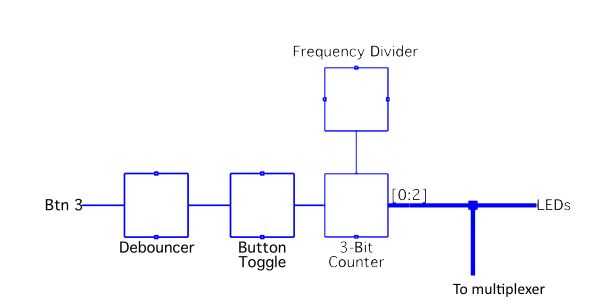 El contador está conectado a un divisor de frecuencia por lo que incrementa a una velocidad razonable. La velocidad a la que los incrementos de contador es también representante de los BPM (beats por minuto) del sintetizador. La salida del contador se conecta con el LED sobre los interruptores en el tablero Nexys2, dando una indicación fácil de que ritmo se está reproduciendo actualmente. La salida va también hacia la señal de selección del multiplexor. El propósito del multiplexor se explicará en la parte 4.