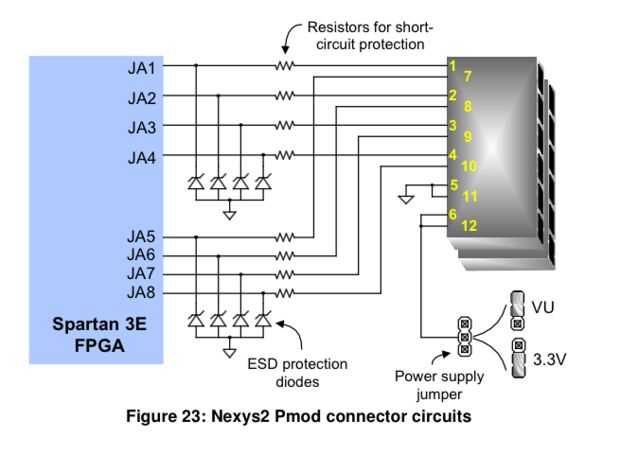 La Junta de SDMONexys tiene varias salidas de pins para Pmods así que usted puede escoger cualquiera. Mirando el diagrama del circuito del conector, podemos ver que pines 5 y 11 son tierra y los pines 6 y 12 son energía y el resto de los pines son datos. Conectamos la tierra de nuestro altavoz (línea negra continua) al pin 11 y el positivo (negro con línea blanca tira) al pin 7 del conector. De nuestro archivo de restricción del usuario en el último paso, genera la onda cuadrada al pin 7.