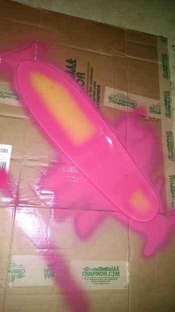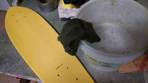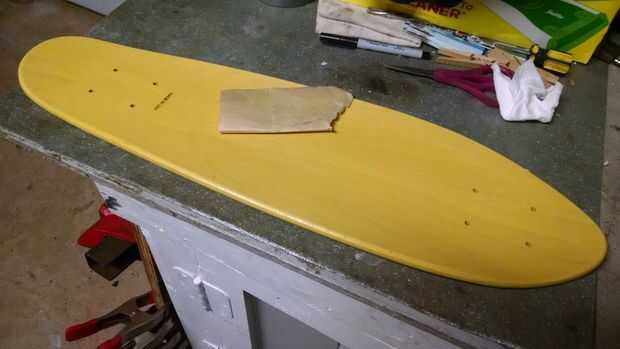 Primero usé un papel de grano arena medio 80 para quitar la horrible mancha amarilla de la cubierta, luego una lija de 150 grano más fina para preparar la superficie para la pintura. Después de limpiar la cubierta con agua estaba listo para comenzar. En un área bien ventilada, sobre un pedazo grande de cartón, solía Krylon pintura de dos-en-uno y la cartilla se aplican 3 ligero y capas incluso a través de la cubierta de aproximadamente 20 minutos aparte. Una hora más tarde me voltea la baraja y repite el mismo proceso en la parte inferior. Después de esperar 24 horas para que la pintura seque completamente I había lijada la cubierta otra vez con ultra fino automotriz lija de 2000 y aplicar 2 manos medianas de capa clara para un brillo extra brillante.