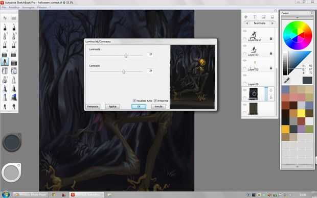 - entonces me di cuenta el fondo en diferentes capas que me incorporé más tarde. Ajustar el brillo, contraste y color de fondo para adaptarse mejor a la figura. - y finalmente agregué mi pequeña firma en la parte inferior derecha de la hoja a una nueva capa.
