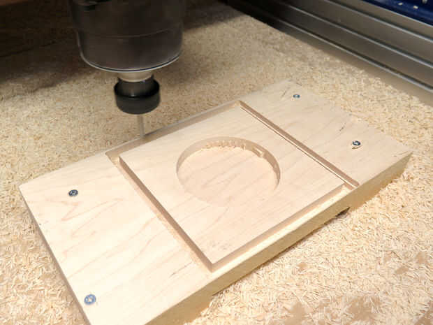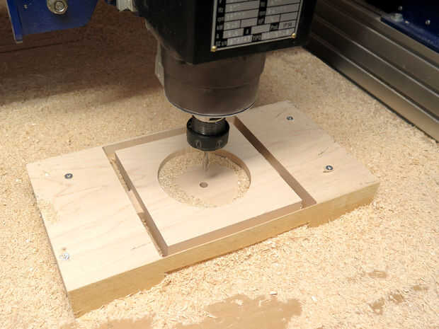 Poner las clavijas en su lugar y voltear la madera colocando los pernos sobre los 2 agujeros en la tabla de sacrificio. Necesita atornillar la pieza hasta la tabla de sacrificio porque los pines sólo alinean correctamente. Cero Z usando la placa Z y comienza la trayectoria de la parte inferior. Lo hará el desbaste y luego las trayectorias de herramienta de acabado.