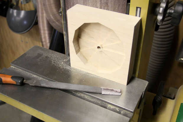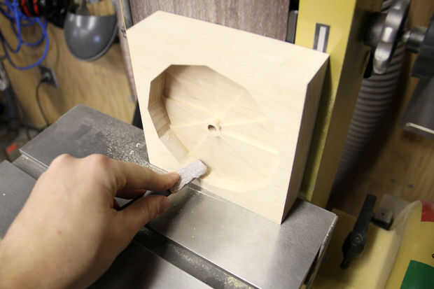 Utilizamos una fresa de 1/4 pulgada de la superficie es no como yo hubiera deseado. Puedo ver algunos pasos menores de la fresa que me gustaría para aplanar hacia fuera en el interior perímetro de la esfera del reloj. Para esto la arena de usé un archivo y un pedazo de papel de lija como se muestra en las fotos.
