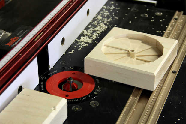 El reloj ahora parecía muy bonito, pero estaba todavía no contento con los bordes. Me decidí a hacer un chaflán de 45 ° con un router de mesa a lo largo de los bordes delanteros. El proceso es bastante sencillo: seleccionar la broca de fresadora, ponerlo en la mesa de fresadora, ajustar la altura y finalmente la práctica con una probeta. A la izquierda de la foto se pueden ver mi material de la prueba y el reloj final. Ahora es tiempo de hacer algunos trabajos de acabado.