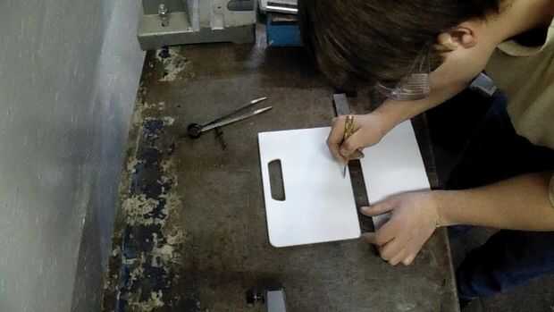 Es el primer paso de construcción real. Tomar las dimensiones del archivo de sketchup para la parte superior e inferior de la pieza. Primero el diseño sobre un trozo de papel solo lo hice supe que todo era antes de empezar hacer imborrables en la pieza de trabajo. A continuación puse los orificios en la pieza de trabajo mediante la medición de los puntos centrales de los bordes. Que desea colocar los agujeros de la varilla roscada es compatible (7 de ésos en ambos lados si tienes un mango como mi pieza acabada, 8 si no te gusta el modelo de sketchup original), para el orificio de 3/4"(1 de los de un lado) y para los 1/8 agujeros para los remaches de fijación y los tornillos pequeños (utilicé 8 en cada lado pero puede utilizar más o menos dependiendo de la preferencia; también estos los orificios no están en el modelo de sketchup que fueron agregados en más adelante alrededor del borde entre el orificio de 5/16" y el borde de la pieza de trabajo). SketchUp es la clave aquí son las dimensiones que usted necesita en el archivo del paso anterior.