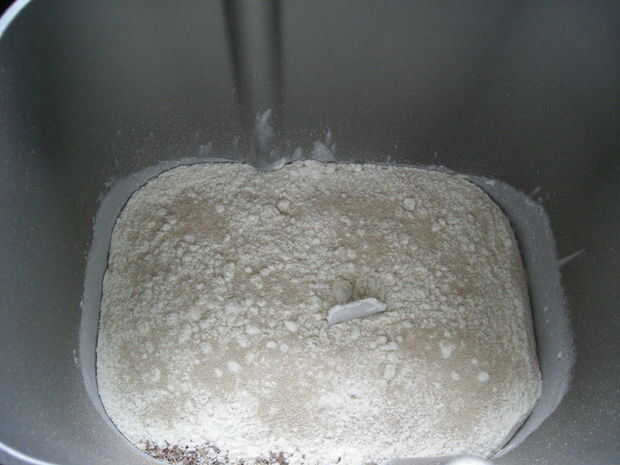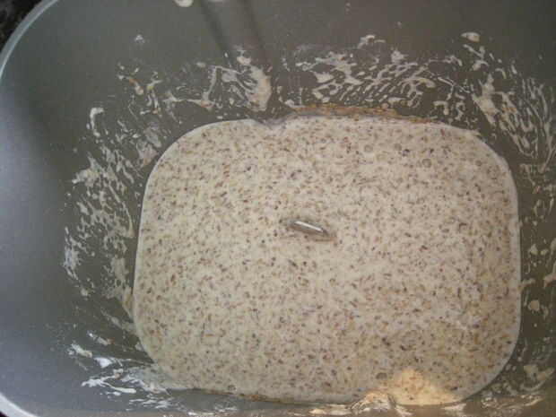 Revuelva con una cuchara o con una batidora a velocidad baja hasta que uniformemente distribuida. Me pongo la máquina de pan en el ajuste de Pizza, esta configuración comienza a revolver inmediatamente. Dejé que revuelva durante 5 minutos o menos. La consistencia de la preferencia es similar a la masa.