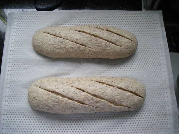 Cuando esté listo para hornear, retire la toalla o abrigo y roza tus panes alrededor de la mitad una pulgada de profundidad con un cuchillo muy afilado o una cuchilla de afeitar.