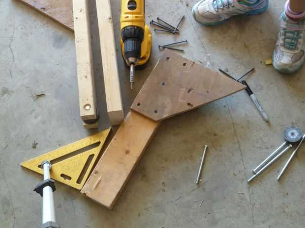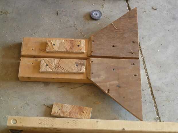 Hicimos un conjunto de listones guía de algún material de desecho del mismo espesor que nuestros refuerzos (otra vez, usted podría integrar tus franjas laterales en los refuerzos como una sola pieza si quieres).  Perforar el agujero piloto y atornilladas a los montantes para hacer dos piezas de la imagen del espejo.  Tenga en cuenta que los agujeros de perno están uno al borde más lejano de los tableros desde el pedal.