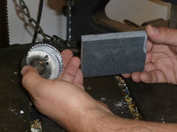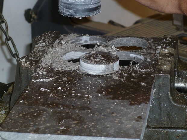 usé una sierra para cortar un disco de alguna cubierta coreana desechos.  Son aproximadamente 1/2" de espesor.  Corté cuatro de ellos hacia fuera.