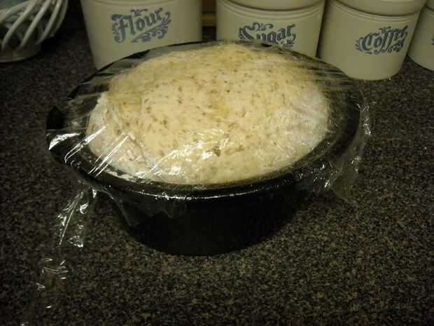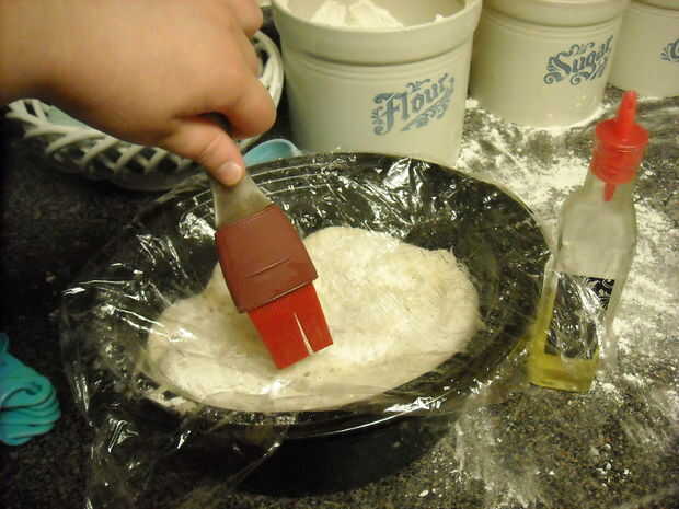 Cuando Amasar poner harina en un gran tazón de fuente y plop la masa en él. Separó un poco de aceite en alguna envoltura de plástico y coloque la envoltura de plástico sobre el tazón de fuente con el aceite de sonido abajo, para evitar que se pegue. Ahora a pie y dejar que la masa doble en tamaño. Generalmente lo dejan seguir por aproximadamente una hora, pero basándose en factores como cómo caliente su cocina es esto pueden tomar más o menos tiempo. Luego volver y aplaste la masa, que es lo que parece. Yo literalmente golpear la masa y luego amasar una o dos veces para que se desinfle. A continuación, cubrir la masa y dejarla reposar 15 minutos más, golpear hacia abajo y repita el mini levantar 3 veces más. Este paso es totalmente opcional, pero ayuda a desarrollar una textura extra liviana y esponjosa en el pan final.