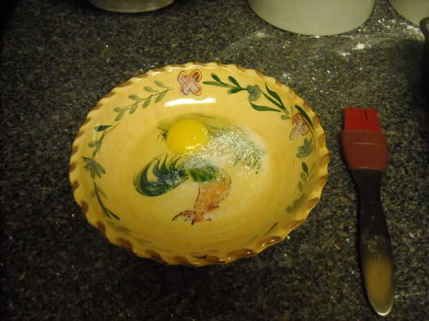 Justo antes de poner el pan en el horno puede batir el huevo solo con un chorrito de leche en polvo y una cucharada de agua (o simplemente una cucharada de leche) y luego extenderlo sobre las tapas del pan con un pincel de repostería, si tienes uno. Esto creará un top bonito, brillante a tu pan y es un paso totalmente opcional.