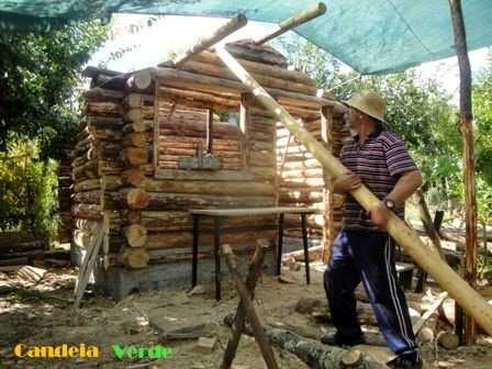 Además el poste central puse más dos de agua, todas ellas con suficiente longitud para cubrir el balcón. Estas vigas son el eucalipto y su diámetro es de unos 12 cm, grosor suficiente Dado el pequeño tamaño de la cabina.
