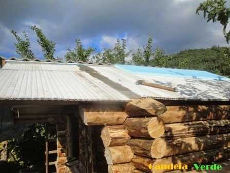 Dio el techo verde, pero no dio para arriba las persianas porque pensé que sería una gran ayuda para el revestimiento y aislamiento de la azotea. Sin embargo, dudó en el tipo de Tejas debe utilizar, pensando que una cubierta con tejas de barro rojo no coincidirá con la cabaña rustica. Entonces descubrió que un techo vecino fue a quitar los azulejos de cemento, que fue compuesta para el sustituto de tejas de barro. Me fui a trabajar preguntando si me podrían vender algunos de estos azulejos, y cual fue mi sorpresa cuando me dijeron que podía tomar gratuitamente los pocos que todavía quedaban como estaban a que vayan poner destruir los pedacitos en un vertedero.