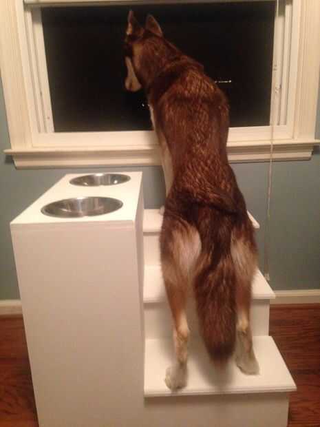 En mi diseño, hay 3 pasos que su perro puede estar parado en, pero en cualquier lado (usted puede elegir) hay un corte hacia fuera para 8" perro tazones de fuente. De esta manera su perro puede comer pero mirar por la ventana al mismo tiempo. También hay una opción (dependiendo de tamaño) para poner una caja de juguetes en la plataforma si quiere mantener todo en un solo lugar.