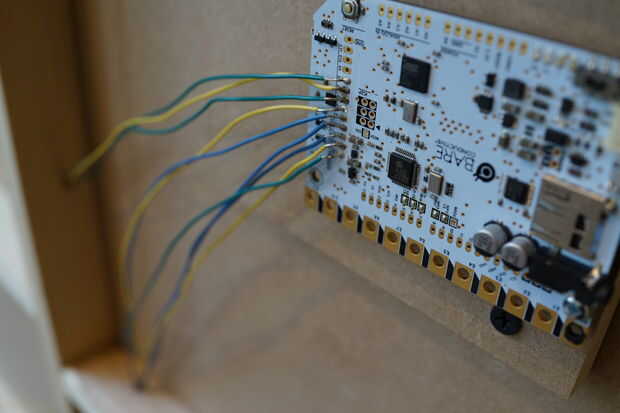 Para conectar la placa a la plataforma, soldar cables a los pines de entrada táctil en el tablero y encadenan los otros extremos de los cables por la parte superior de la Junta.