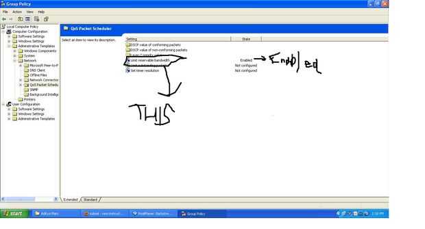 Haga clic en ancho de banda Reservable límite Marque la casilla de "Enabled" y cambiar el límite de ancho de banda de 20% a 0% y woo! Compruebe su velocidad de internet ahora. Hay un pequeño cambio.