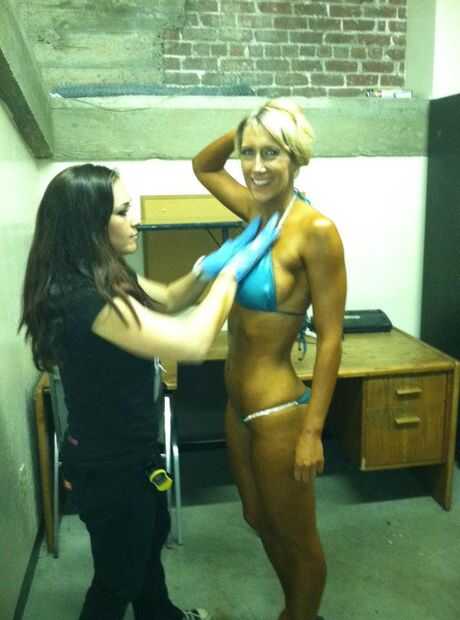Justo antes de ir en el escenario, los curtidores backstage hará que vean perfecto. Ellos Pula a mano para cubrir algún defecto en el bronceado, ayudarle con su mordida de bikini para asegurarse de que su parte superior e inferior no mover y difundir el brillo del cuerpo de usted para que sus músculos se ven muy bien a la luz.