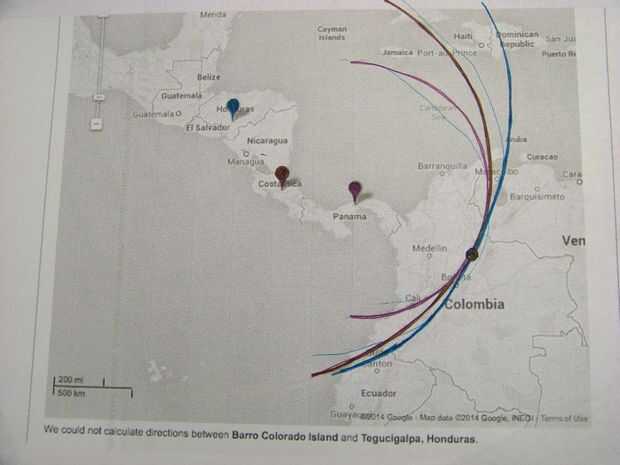 Ejemplo: 500 km (escala del mapa) = 2,8 cm (regla), así que 795 km (distancia epicentral del terremoto colombiano primer de la estación) = 4,45 cm (mapa)... 4,45 cm se mide hacia fuera en la brújula y un extremo de ella se coloca en el balón para la estación que estaba 795 km el terremoto. Se dibuja un círculo que es 4,45 cm de radio alrededor de él (el centro del círculo es la estación).