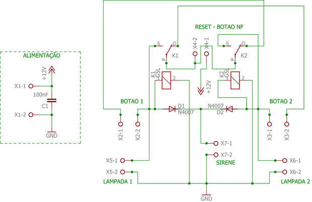 Acima vocês podem observar todo o esquema dos componentes desse equipamento. Ele é um si de entre de la ligados "de 12v relés circuito simples com dois". Quando um dos botões é ativado, acende os leds macroprudencial un contacto ele e desabilita o outro, essa configuração ficará ativa até a interrupção da alimentação dos pinos comuns dos relés ao se pressionar o botão NF.