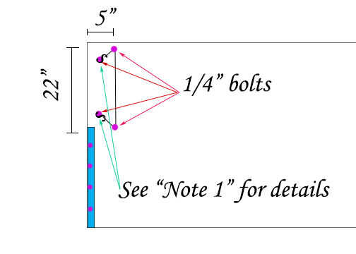 Sabiendo que quería mi passer que sólo menos de la mitad del tamaño original de la Junta de la placa es 4ftx8ft, y estaba pensando preferencia en tamaño de passer mientras que todavía maximiza mi espacio, decidí hacer dos orificios de 1/4" a 22 pulgadas de uno al otro y sólo una pulgada o tan abajo desde la parte superior de la Junta y que sea cerca de 5 pulgadas hacia fuera desde el lado. (véase imagen)