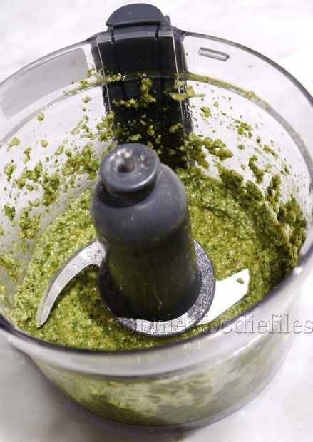 2. ahora, hacer el pesto de albahaca. Tomar su amado procesador de alimentos y coloque la cuchilla en. Añadir el ajo picado, hojas de albahaca y piñones. Agregar queso parmesano rallado, 20 muecas de pimienta negra y la sal del mar. Verter 60 ml de su aceite con sabor a fruta en él. Colóquese la tapa y pulso algunas veces o mayor poder mezclar más finamente. Depende de usted! A veces, me gusta un pesto más grueso pero a veces me gusta ser más finas. He añadido 30 ml de aceite de extra por lo es 90 ml en total. ¡ Sabor! Se debe probar primero la albahaca y luego todo el resto! Tiene que ser picante un poco con ese ajo crudo y ese encantador parmesano! Me gusta que mi pesto no es de graso. Este es el camino, me gusta! :).