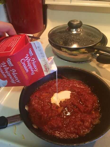 Mientras que la pasta es el esfuerzo, añadir la nata a la sartén de la salsa y dejar cocer a fuego lento durante unos minutos.