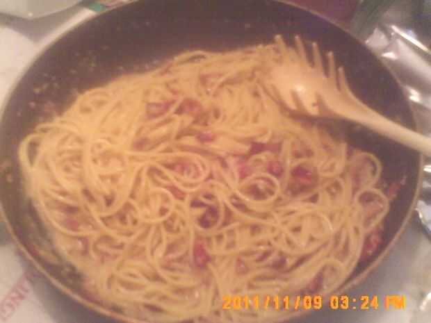 Escurrir la pasta y colocarla en la sartén con el tocino cocido caliente.