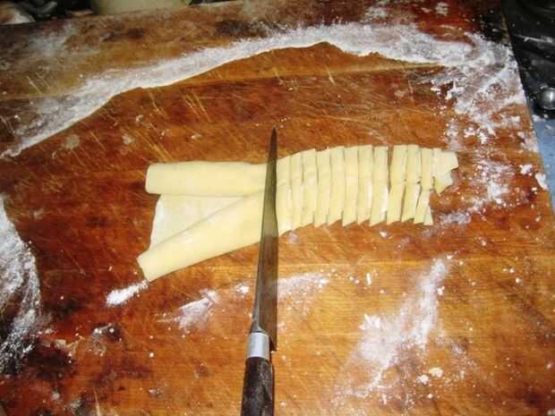 Enrollar la masa a cada lado para las dos partes se reúnen en el centro y cortaron en tiras
